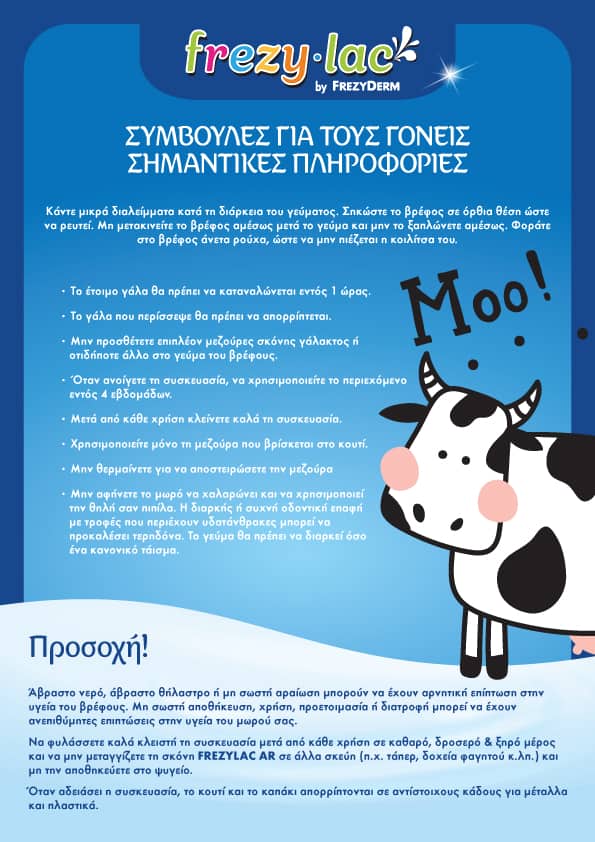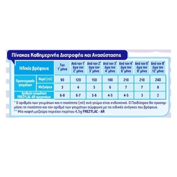 Το FREZYLAC AR είναι ένα διαιτητικό τρόφιμο σε σκόνη κατάλληλο για την διαιτητική αγωγή διαχείρισης των αναγωγών του βρέφους. Με υψηλότερο ιξώδες λόγω της παρουσίας του φυσικού πηκτικού παράγοντα Locust Bean Gum (κόμμι χαρουπιού) και σε συνδυασμό με τις καλλιέργειες Bifidus (Bifidobacterium lactis) συνεπικουρεί στη μείωση των επεισοδίων παλινδρόμησης (γουλίτσες).