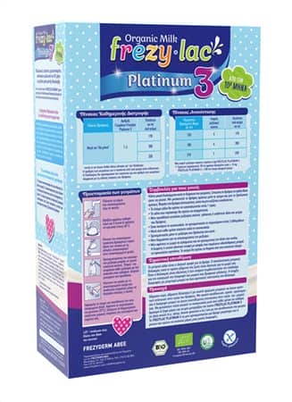 Το FREZYLAC PLATINUM 3 είναι βιολογικό κατσικίσιο γάλα σε σκόνη, κατάλληλο για βρέφη από τον 10ο μήνα στο πλαίσιο μιας μεικτής διατροφής. Βασισμένο στις αρχές της βιολογικής εκτροφής αιγών και τους Κανονισμούς της Ε.Ε. που διέπουν τα παρασκευάσματα για βρέφη και τα παρασκευάσματα δεύτερης βρεφικής ηλικίας.