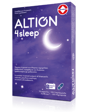 Το Altion 4Sleep είναι ένα συμπλήρωμα διατροφής με 4 διαφορετικά φυτικά εκχυλίσματα χαμομηλιού, βαλεριάνας, πασιφλόρας και λυκίσκου, εμπλουτισμένα με μελατονίνη. Συμβάλλει στη μείωση του χρόνου που χρειάζεται κανείς για να κοιμηθεί και βοηθά στην χαλάρωση και στην ανακούφιση των ήπιων συμπτωμάτων του στρες.